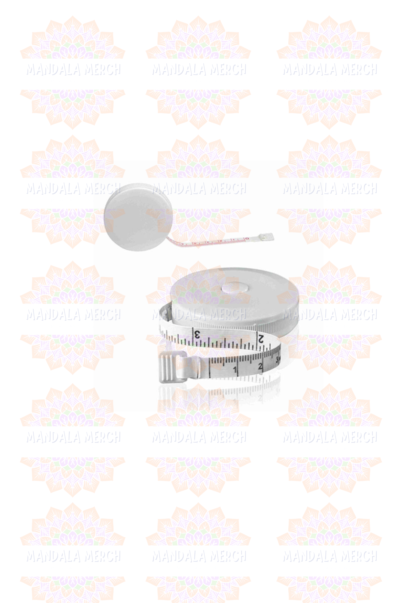 Cinta métrica de 1 mt. en estuche circular con botón retráctil en el centro.