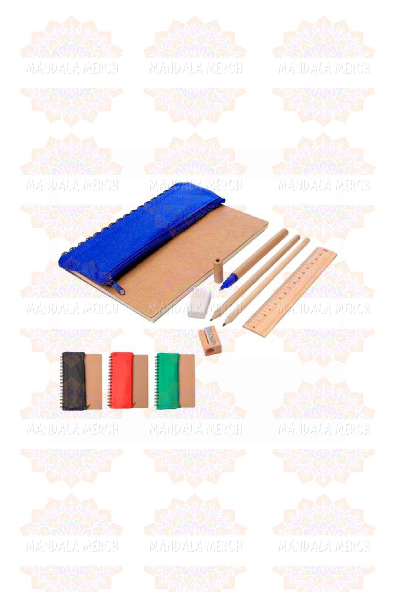 Contiene: 70 hojas color crema, 1 Lapicero, 2 Lápiz, 1 Regla (15cm), 1 Borrador y 1 Tajador (todo ecológico)