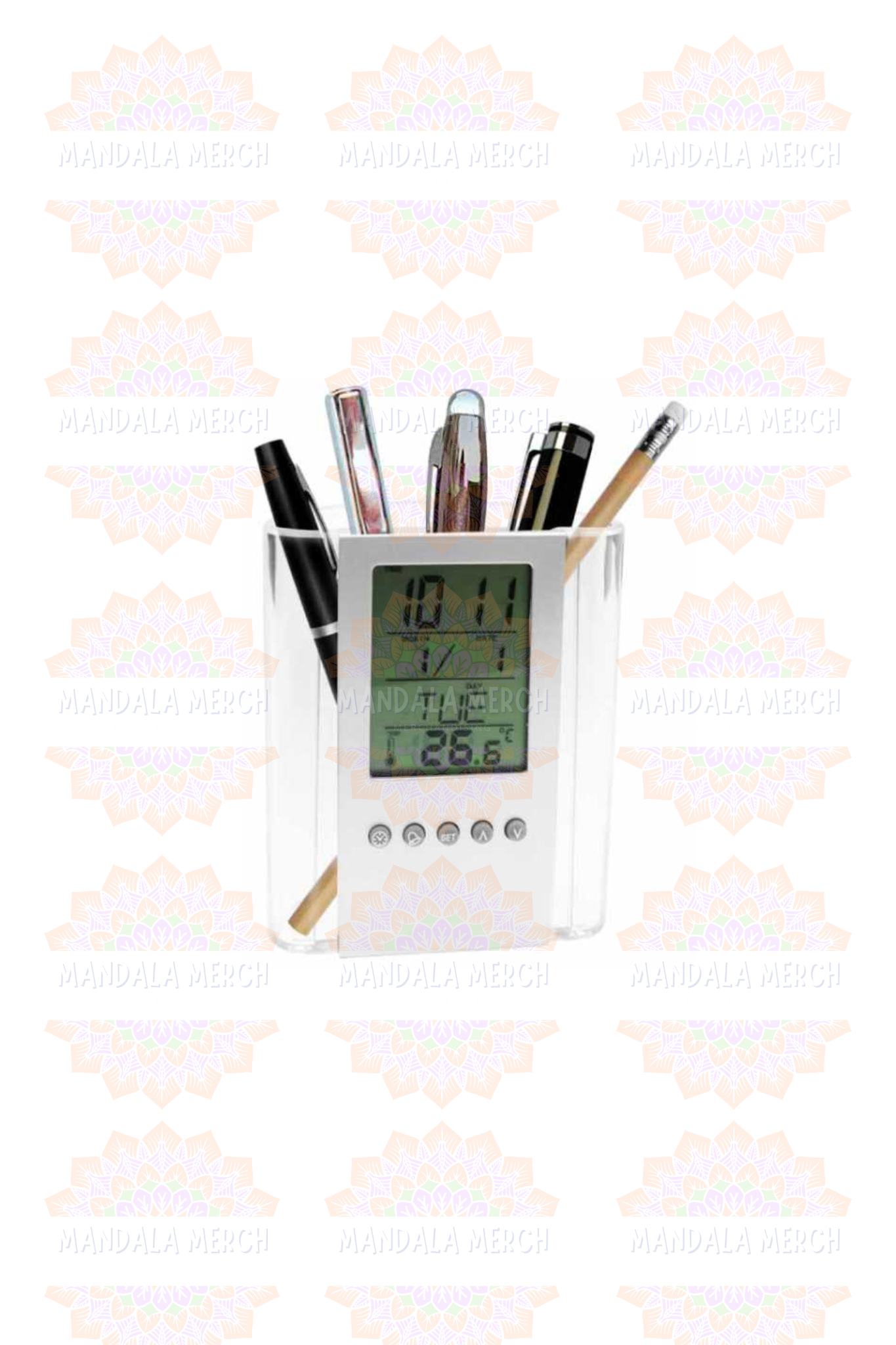Con reloj en la parte frontal que contiene: alarma, fechero y temperatura.